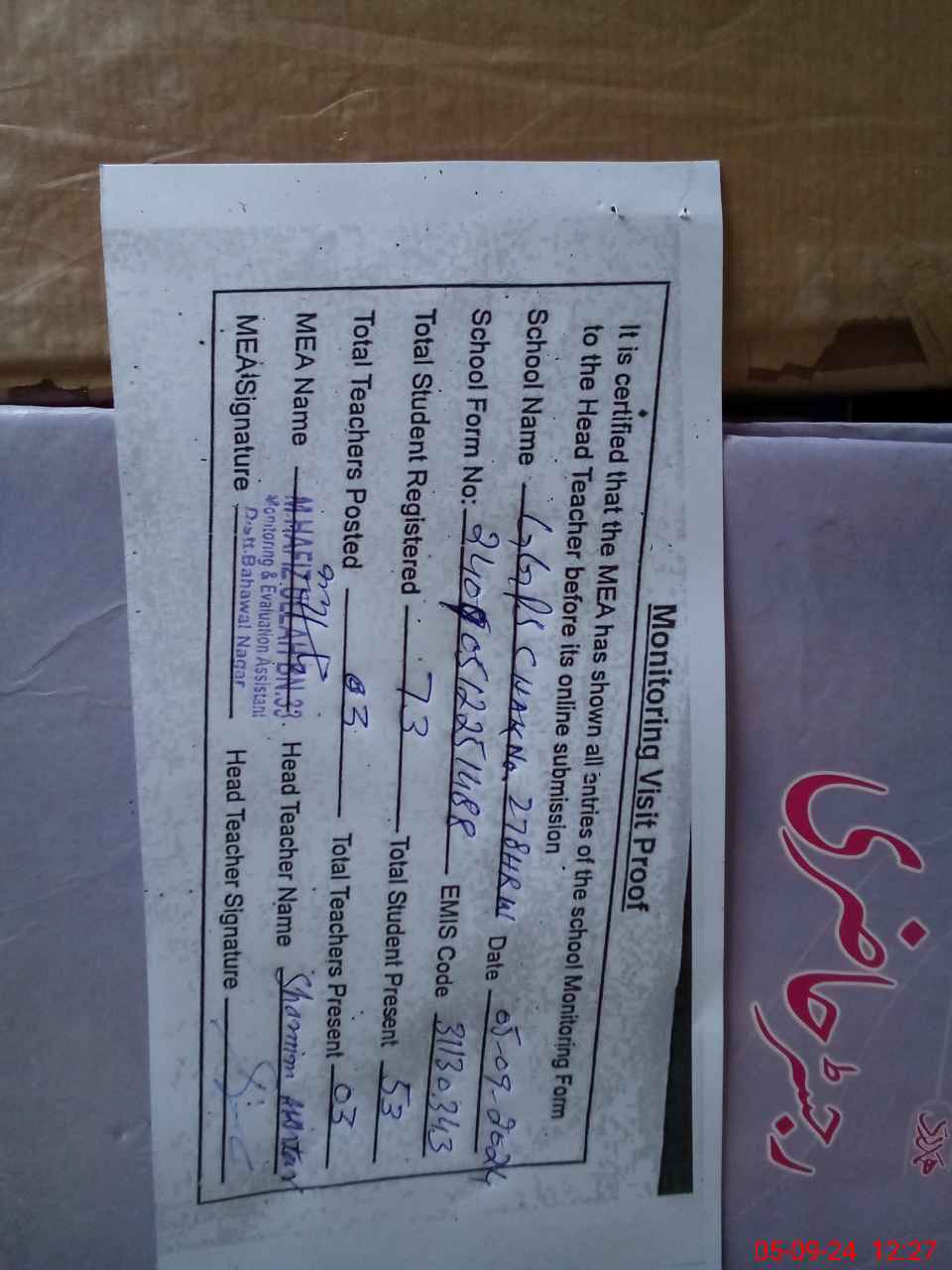 | Attendance Register | Head Teacher | MEA with School | Visit Proof |