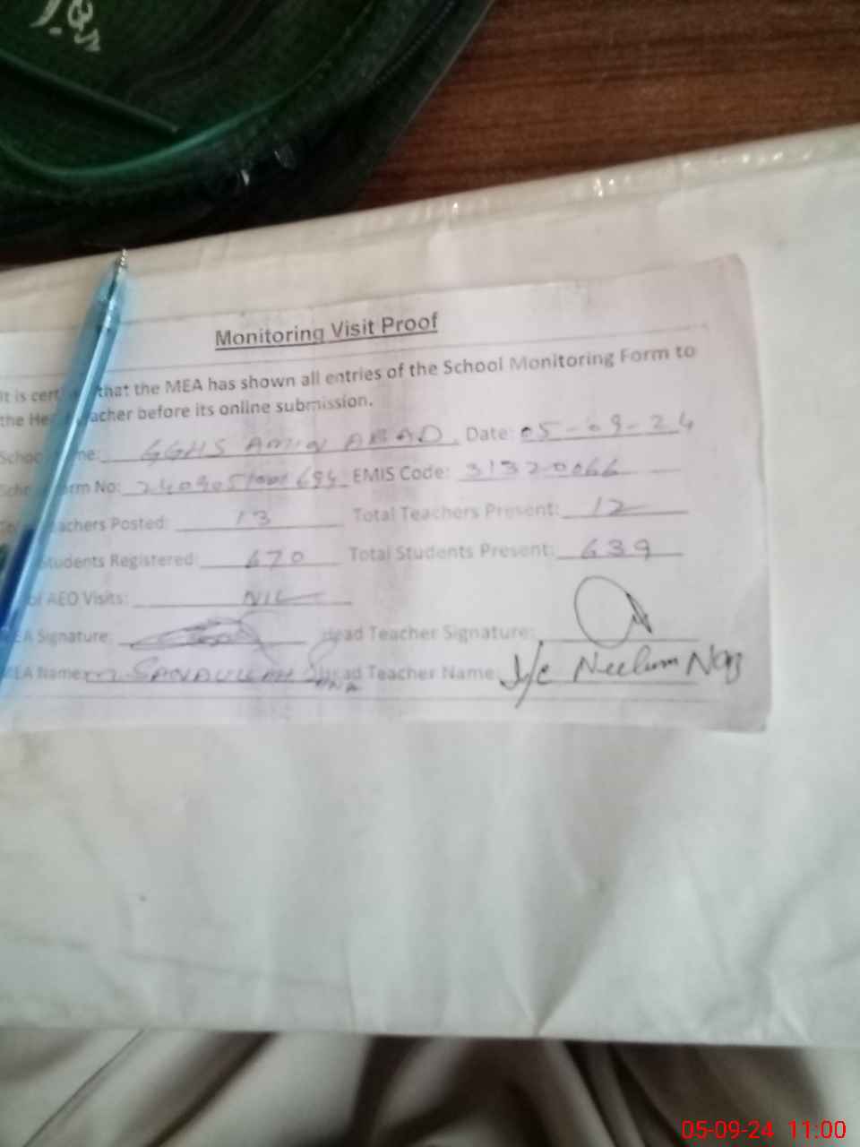 | Attendance Register | Head Teacher | MEA with School | Visit Proof |