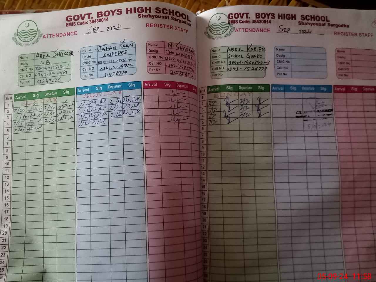 | CNIC | Full Name | Designation | R/C | Absence during last cal. month |