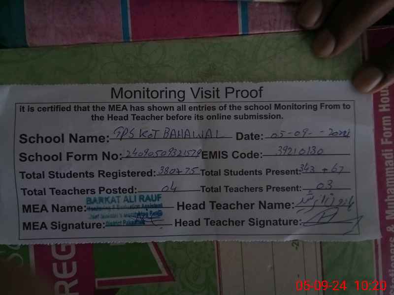 | EMIS Code: 39210130 | Name of School: GPS KOT BAHAWAL | |||