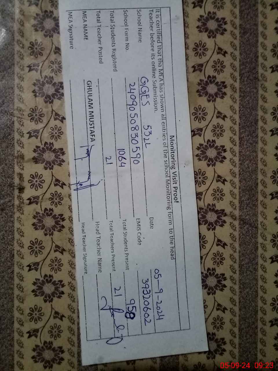| Name: FA**** NA**** Designation: (School Headmaster's/Headmistress's) SST Phone/Cell Number: 03**** |