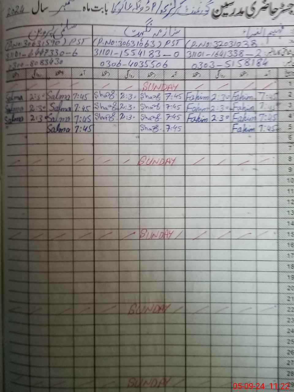 | CNIC | Full Name | Designation | R/C | Absence During Last Calender Month |
