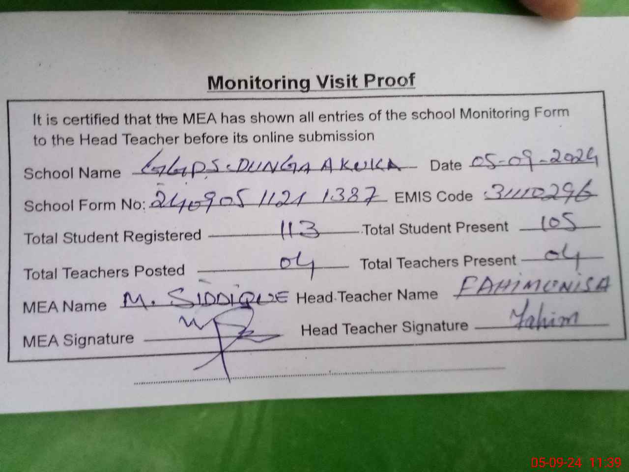 | Attendance Register | Head Teacher | MEA with School | Visit Proof |