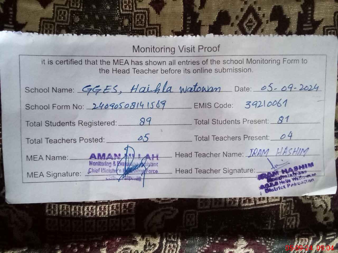 | Attendance Register | Head Teacher | MEA with School | Visit Proof |