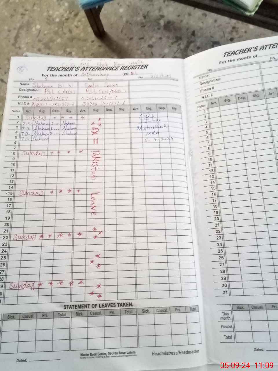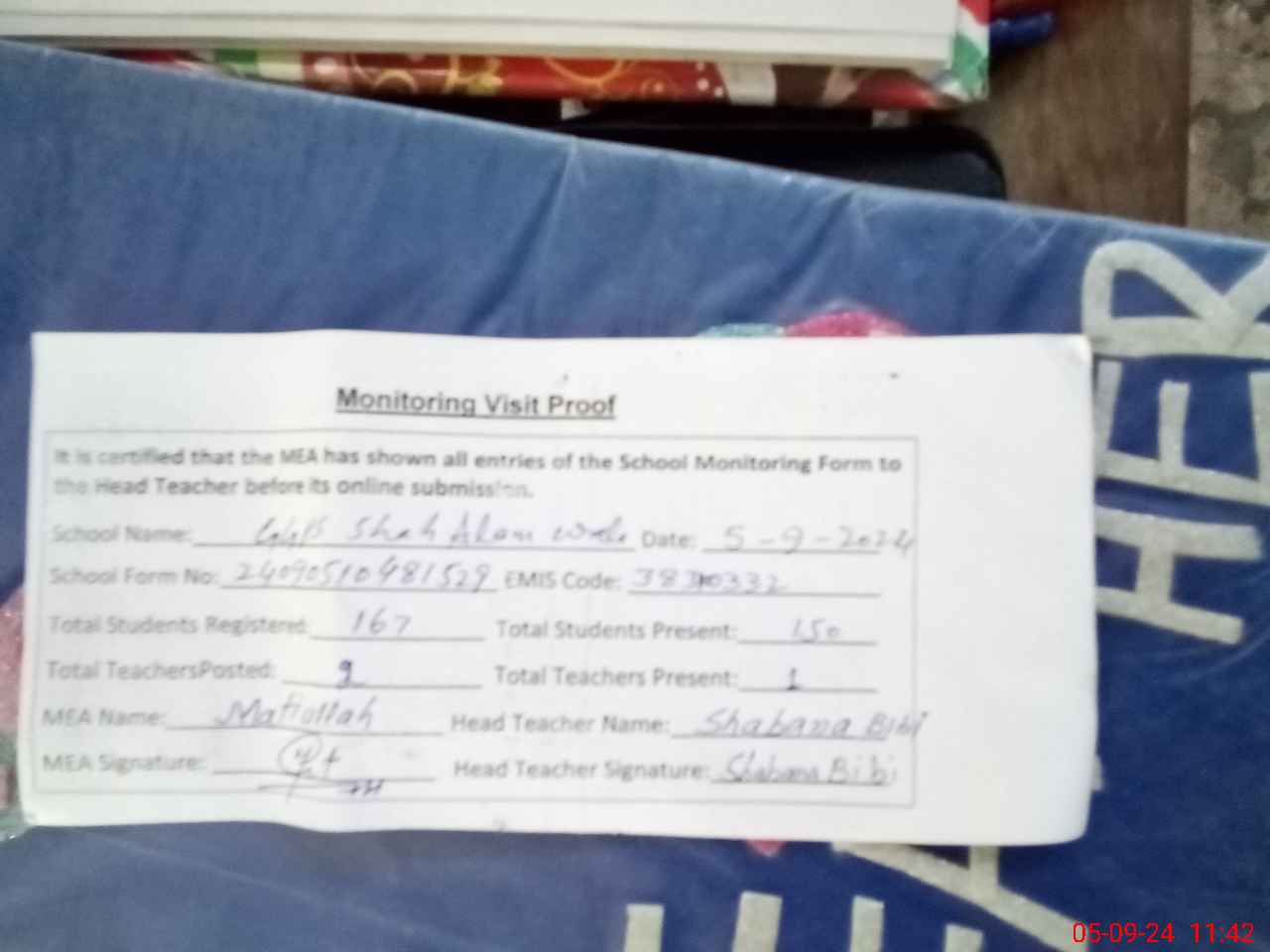| Total no. of Classrooms: 4 No. of Classrooms Used for Teaching: 4 No. of Classrooms Storing Old Furniture, FTBs, etc: 0Comments if Any: No NSB record found second shift students September attendence not carry out even name of students not written on register more over teacher Uzma bibi second shift teacher attendence not carry out since 3 September first shift and regular teacher Sadia Sa |