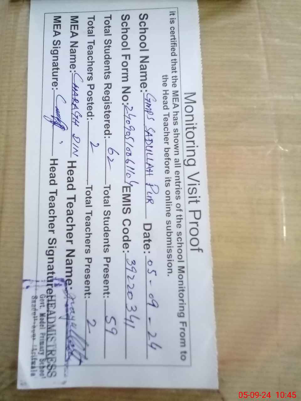 | Attendance Register | Head Teacher | MEA with School | Visit Proof |