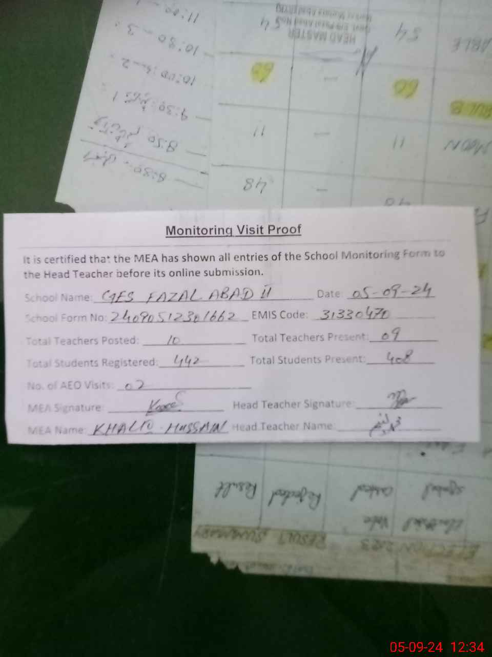 | Attendance Register | Head Teacher | MEA with School | Visit Proof |