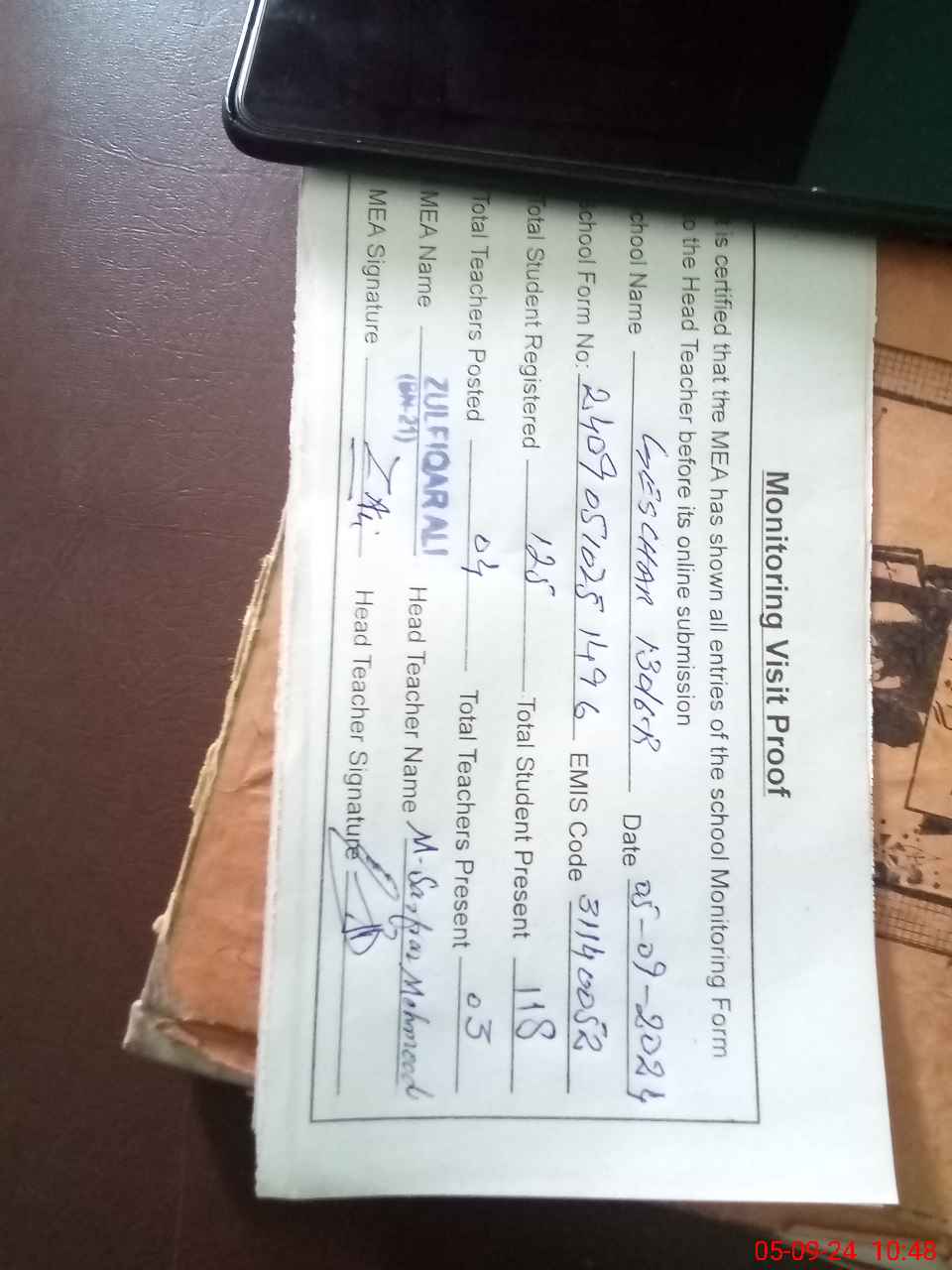 | Attendance Register | Head Teacher | MEA with School | Visit Proof |