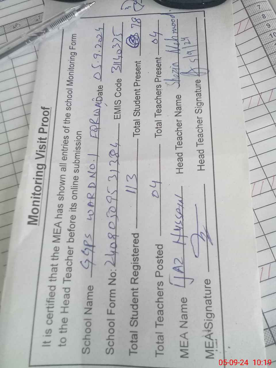 | Attendance Register | Head Teacher | MEA with School | Visit Proof |