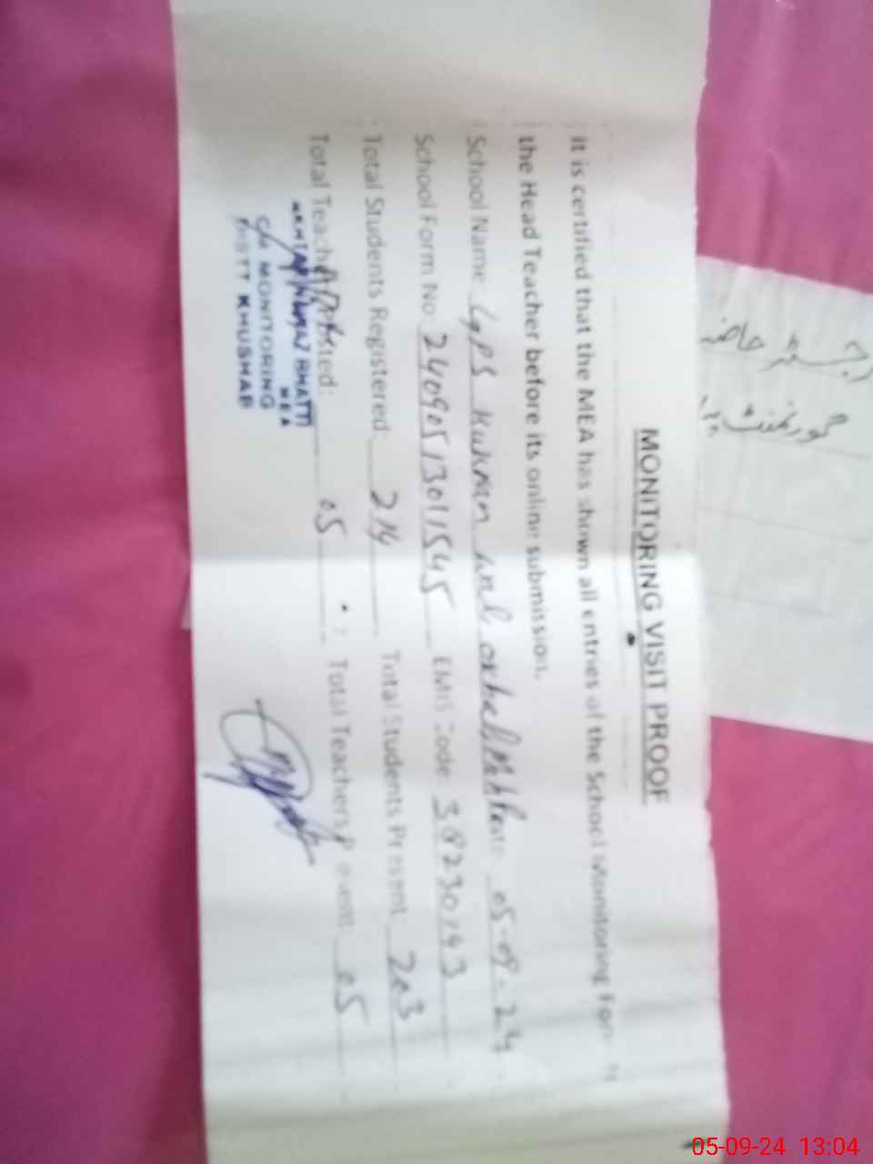 | Certified that this School was Inspected by the Undersigned MEA/DMO Today and the Information Stated Above is as Per Record. | |||||