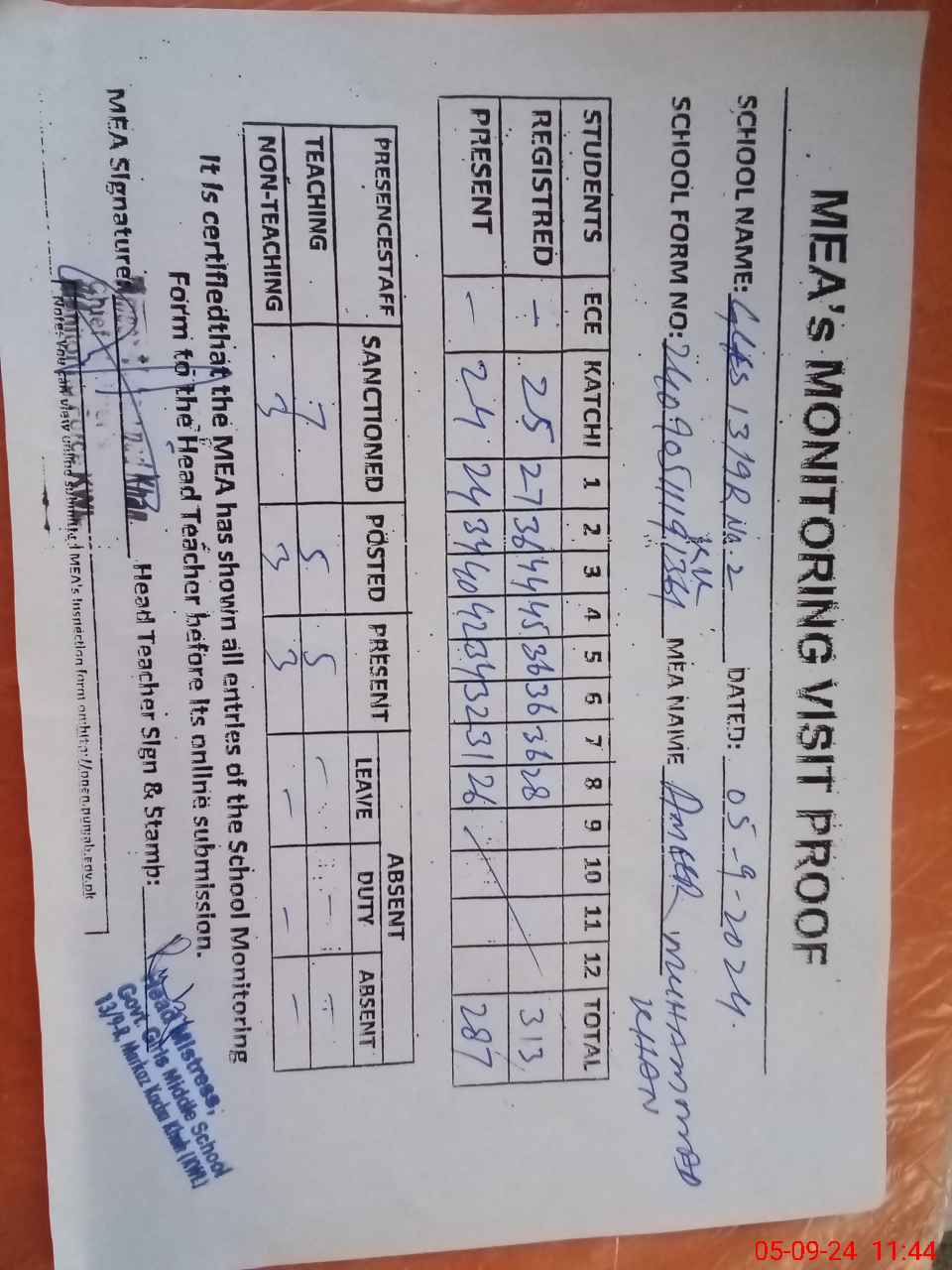 | Attendance Register | Head Teacher | MEA with School | Visit Proof |