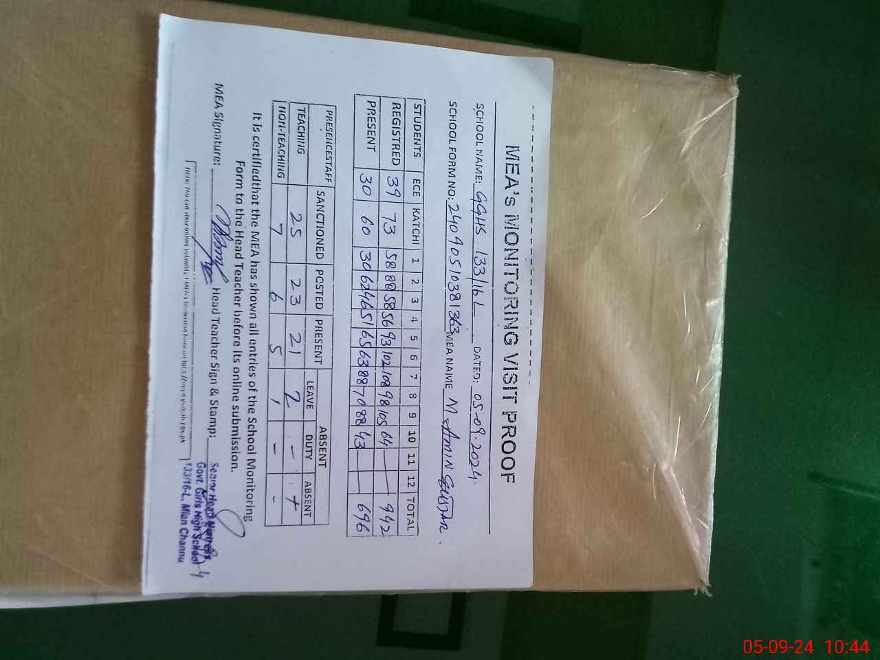 | Attendance Register | Head Teacher | MEA with School | Visit Proof |