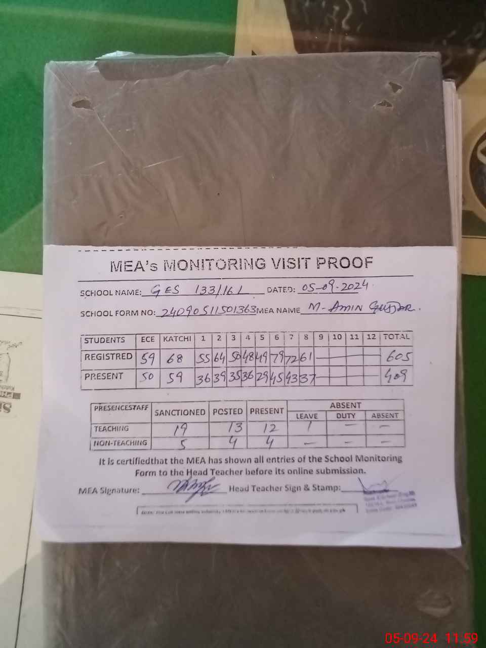 | Attendance Register | Head Teacher | MEA with School | Visit Proof |