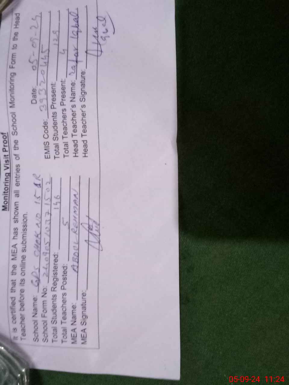 | Attendance Register | Head Teacher | MEA with School | Visit Proof |