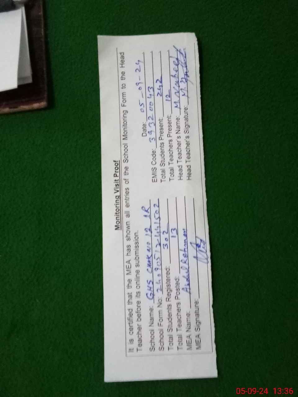 | Attendance Register | Head Teacher | MEA with School | Visit Proof |