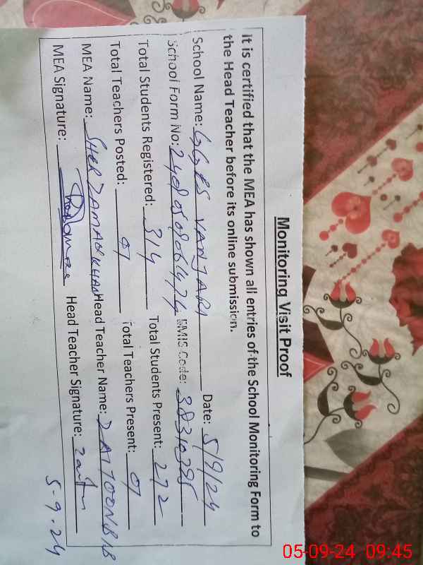 | Attendance Register | Head Teacher | MEA with School | Visit Proof |