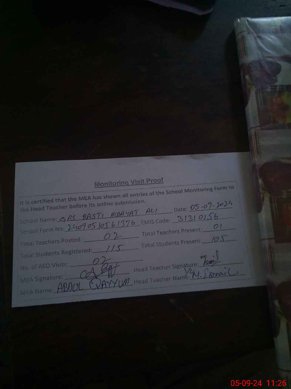 | EMIS Code: 31310156 | Name of School: GPS BASTI HIDAYAT ALI | |||