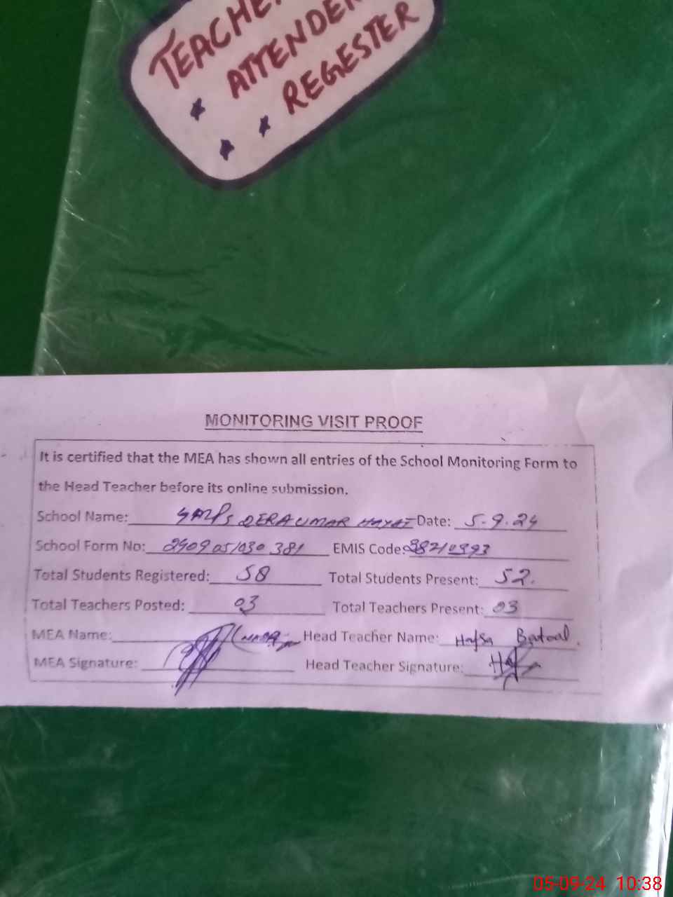 | Attendance Register | Head Teacher | MEA with School | Visit Proof |