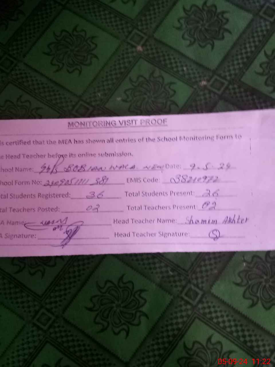 | Attendance Register | Head Teacher | MEA with School | Visit Proof |