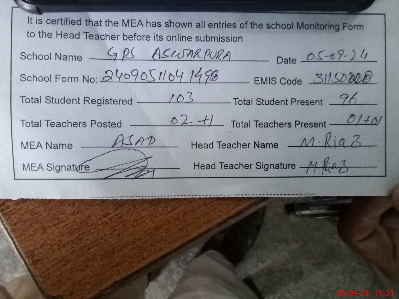 | Attendance Register | Head Teacher | MEA with School | Visit Proof |
