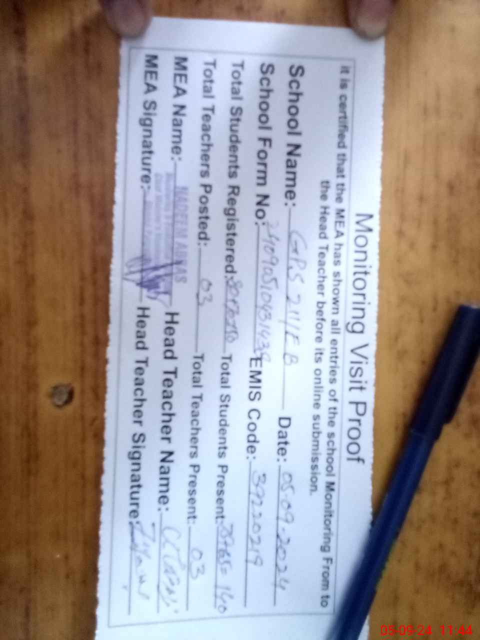 | Attendance Register | Head Teacher | MEA with School | Visit Proof |