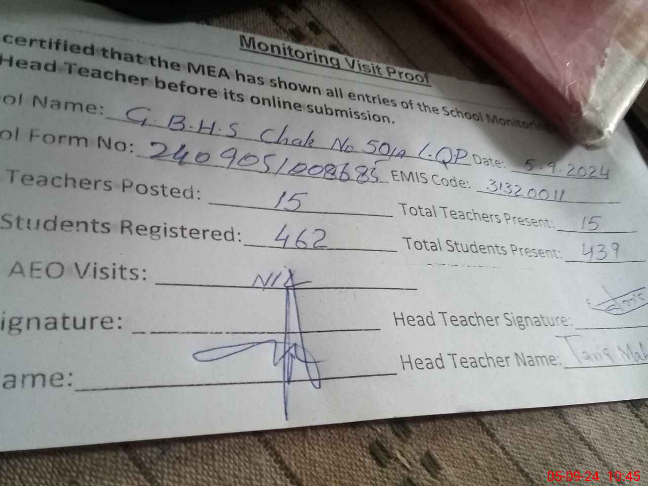 | EMIS Code: 31320011 | Name of School: GHS CHAK NO 50/A | |||