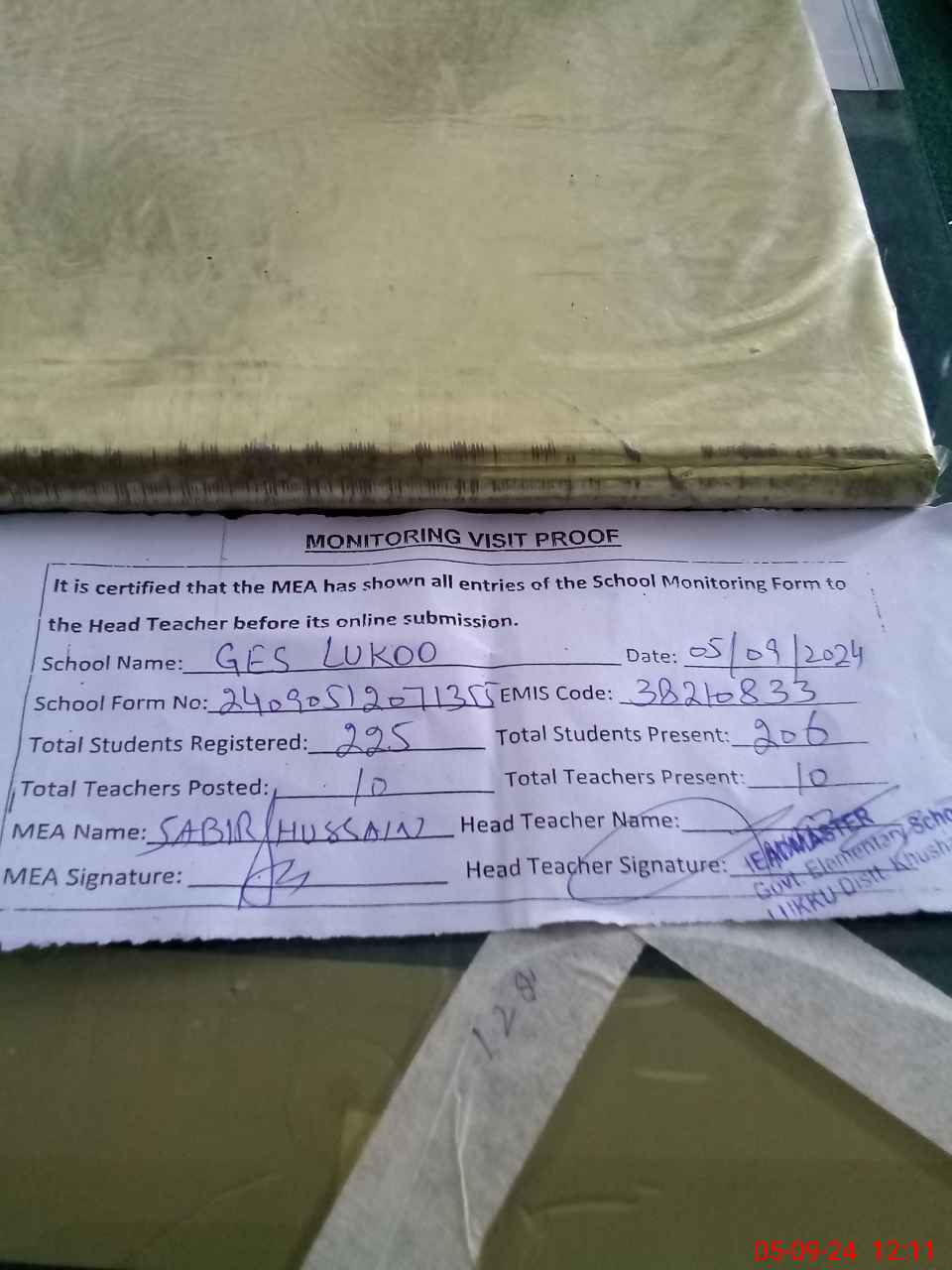 | Certified that this School was Inspected by the Undersigned MEA/DMO Today and the Information Stated Above is as Per Record. | |||||