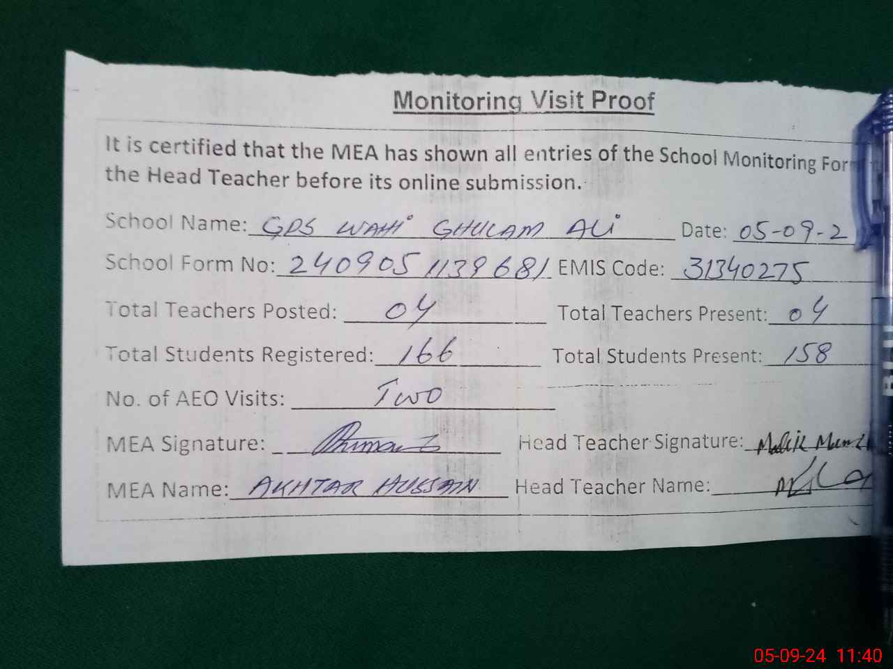 | Attendance Register | Head Teacher | MEA with School | Visit Proof |