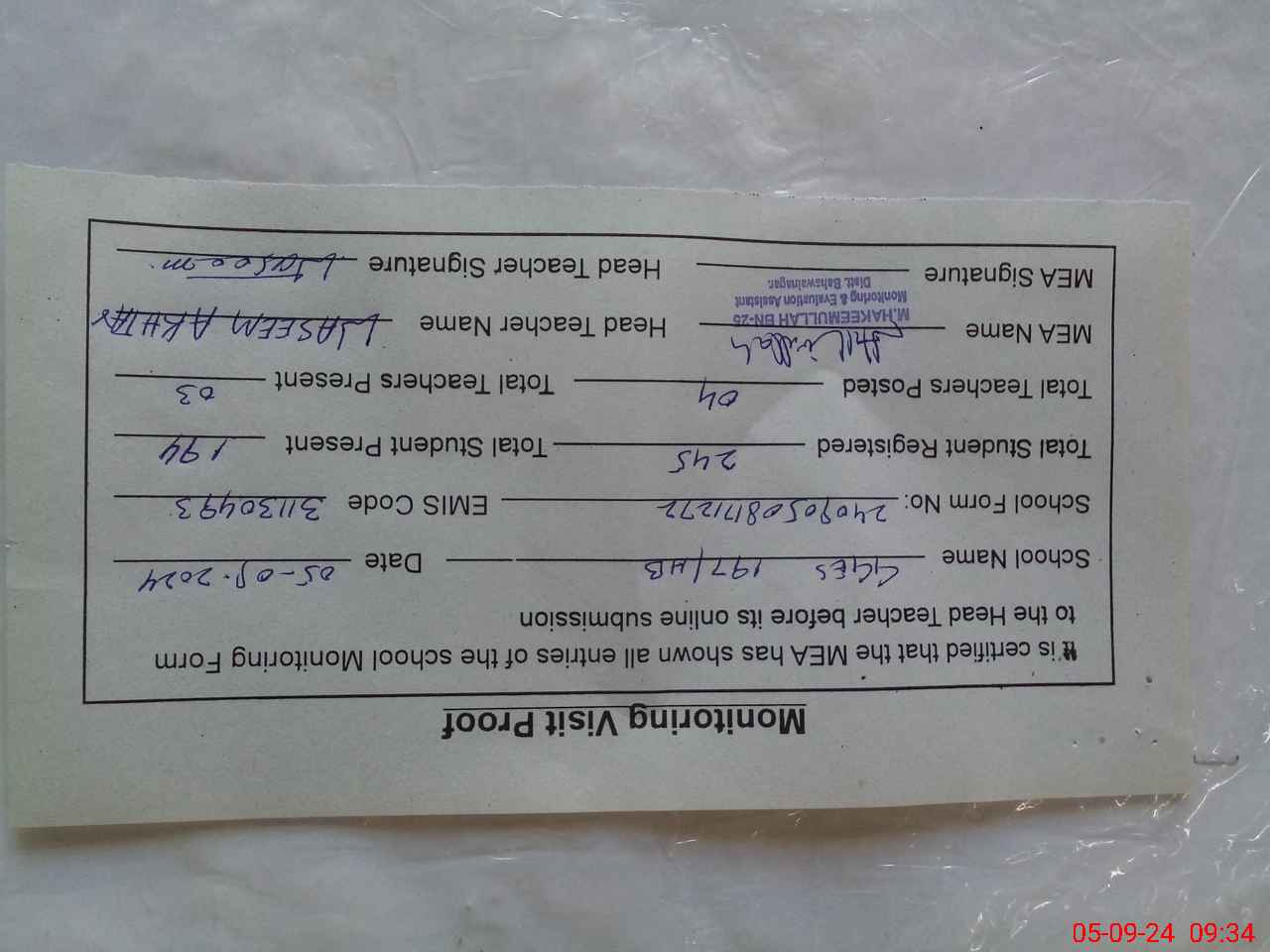 | Monitoring Date: 05-09-2024 | Start Time: 05-09-2024 08:17 AM | End Time: 05-09-2024 09:06 AM | Name of MEA: Mu**** ha**** ul**** BN25 | |