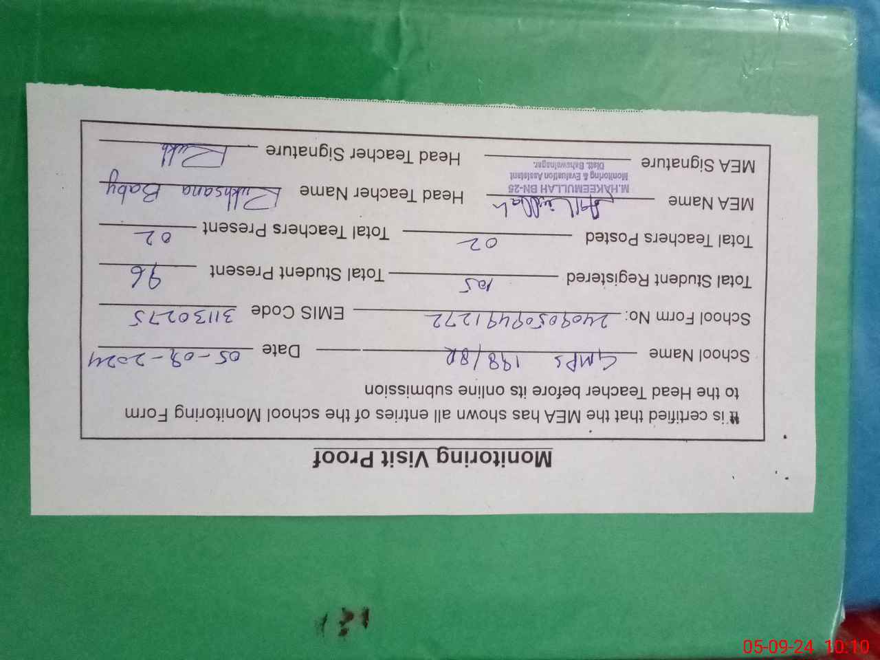 | Certified that this School was Inspected by the Undersigned MEA/DMO Today and the Information Stated Above is as Per Record. | |||||