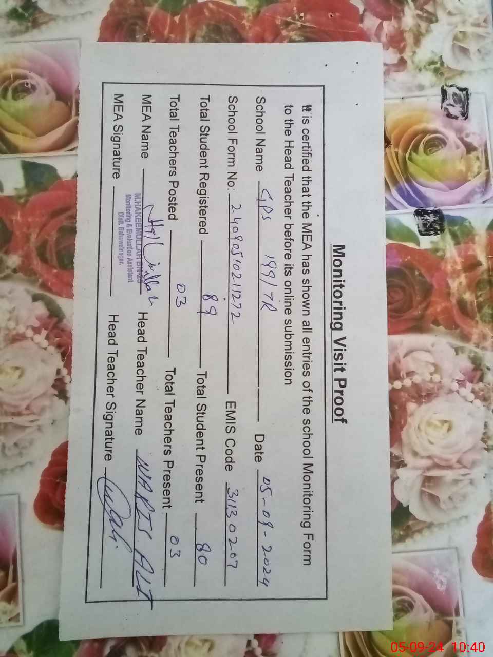 | Attendance Register | Head Teacher | MEA with School | Visit Proof |