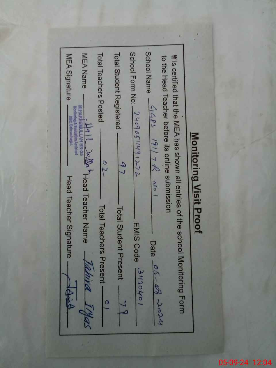 | Attendance Register | Head Teacher | MEA with School | Visit Proof |
