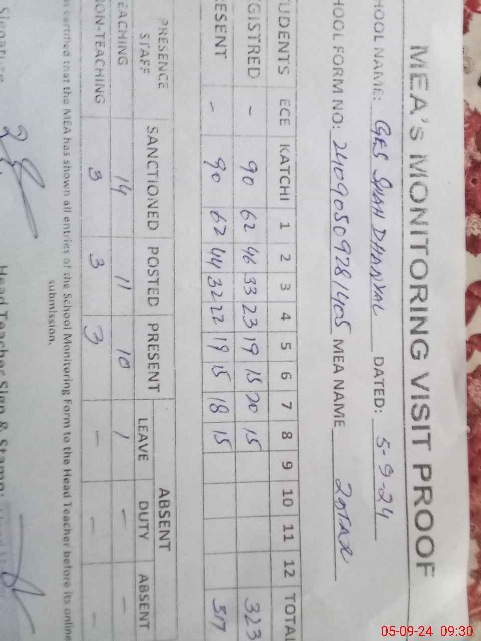 | Attendance Register | Head Teacher | MEA with School | Visit Proof |