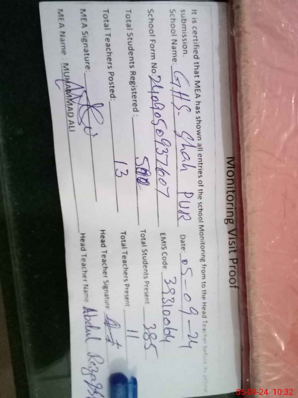 | EMIS Code: 39310064 | Name of School: GHS SHAH PUR | |||