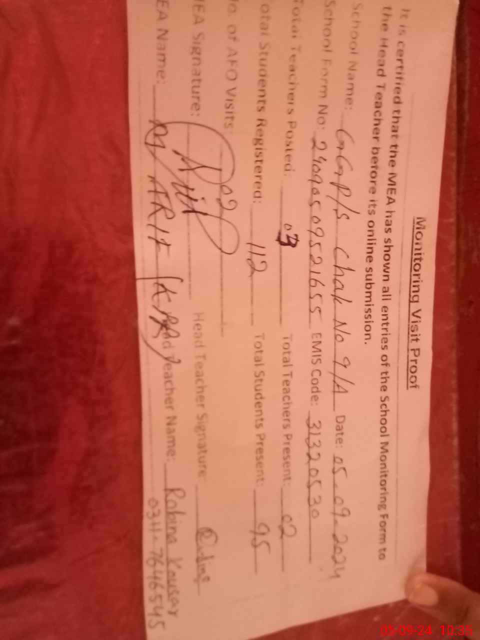 | EMIS Code: 31320530 | Name of School: GGPS CHAK NO. 9/A | |||