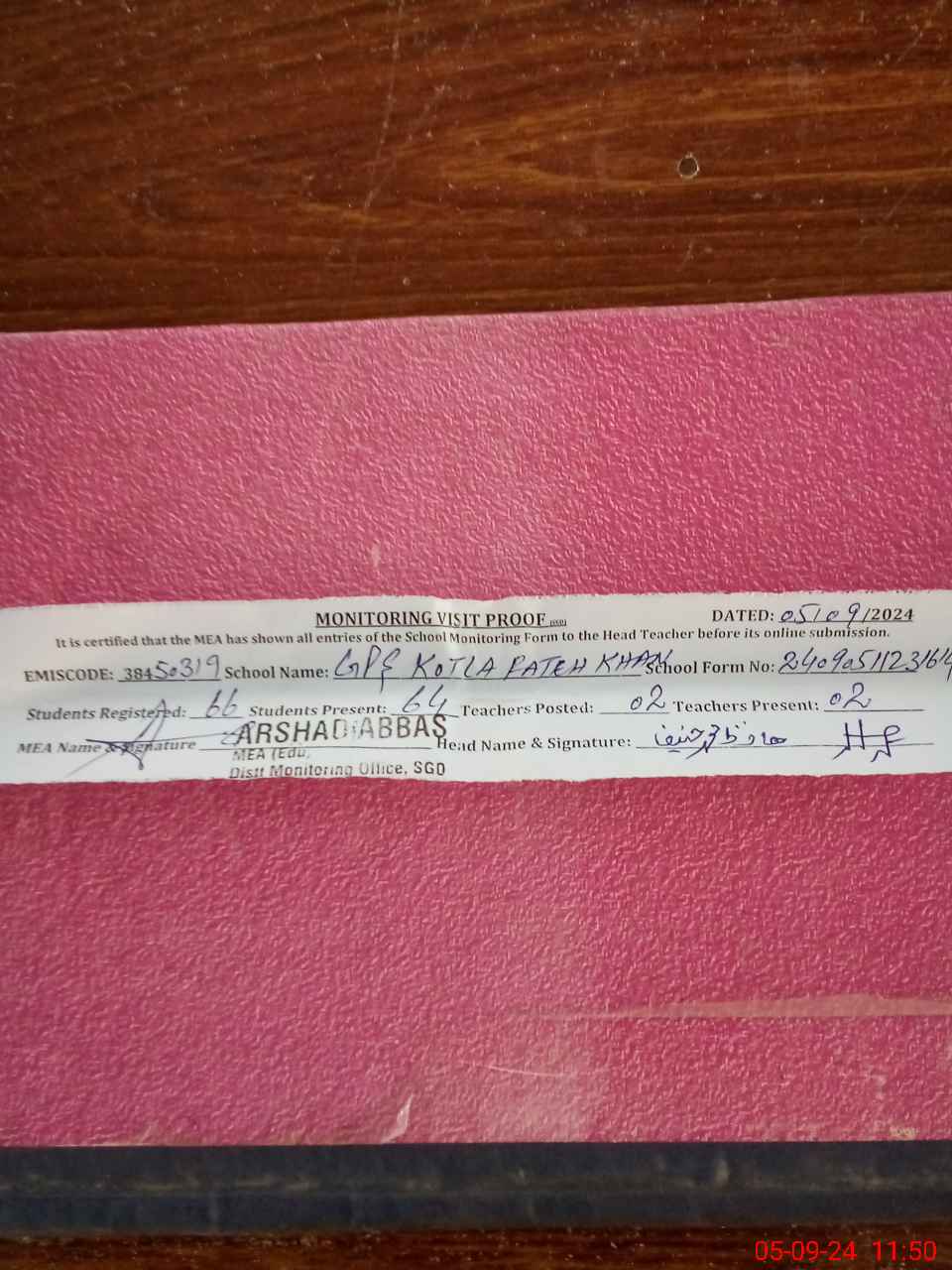 | Attendance Register | Head Teacher | MEA with School | Visit Proof |