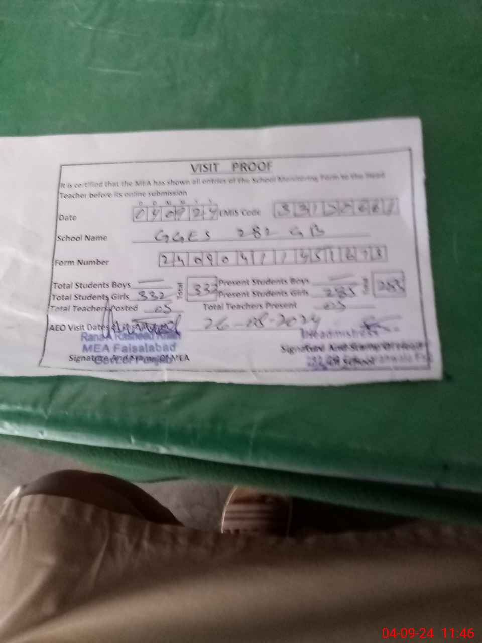 | EMIS Code: 33120661 | Name of School: GGES CHAK 282 GB SATIANA | |||