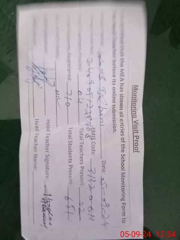 | Attendance Register | Head Teacher | MEA with School | Visit Proof |