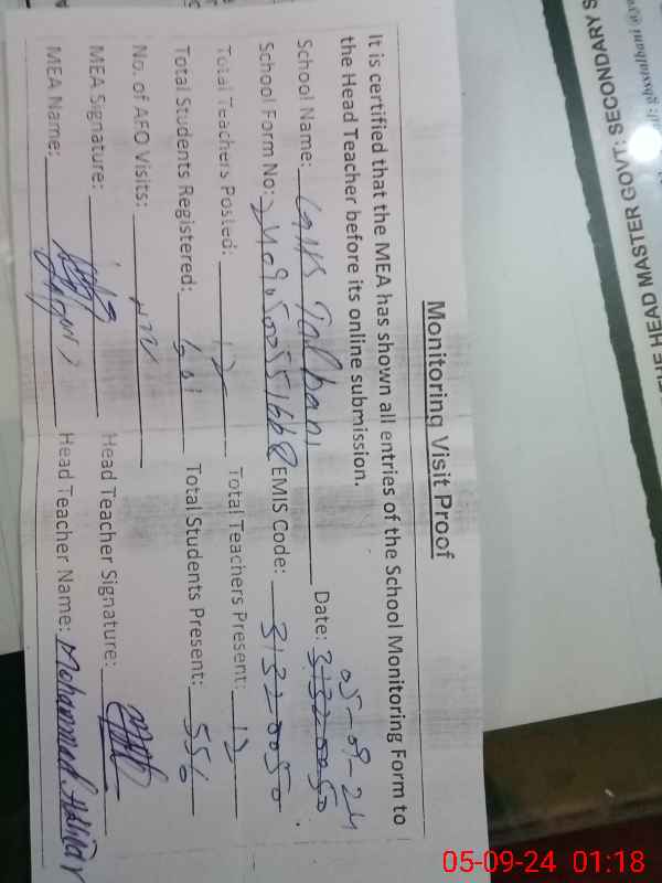 | EMIS Code: 31320050 | Name of School: GHS TALBANI | |||