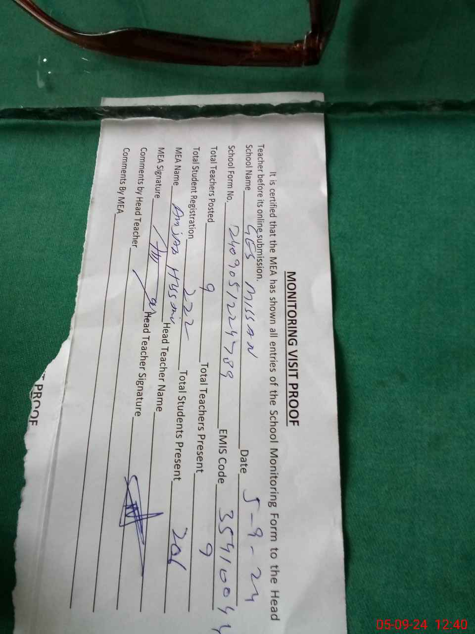 | Attendance Register | Head Teacher | MEA with School | Visit Proof |