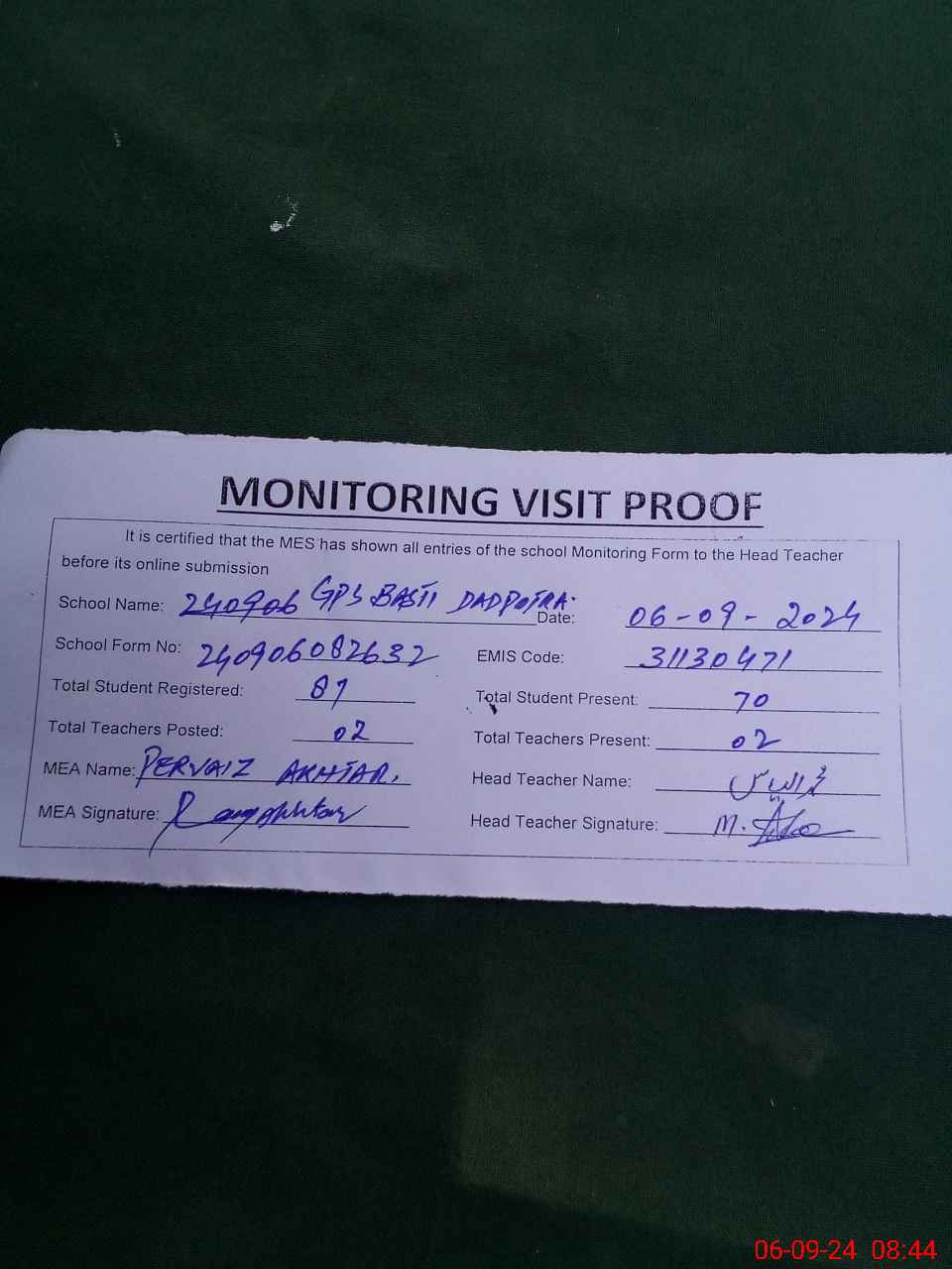 | Certified that this School was Inspected by the Undersigned MEA/DMO Today and the Information Stated Above is as Per Record. | |||||