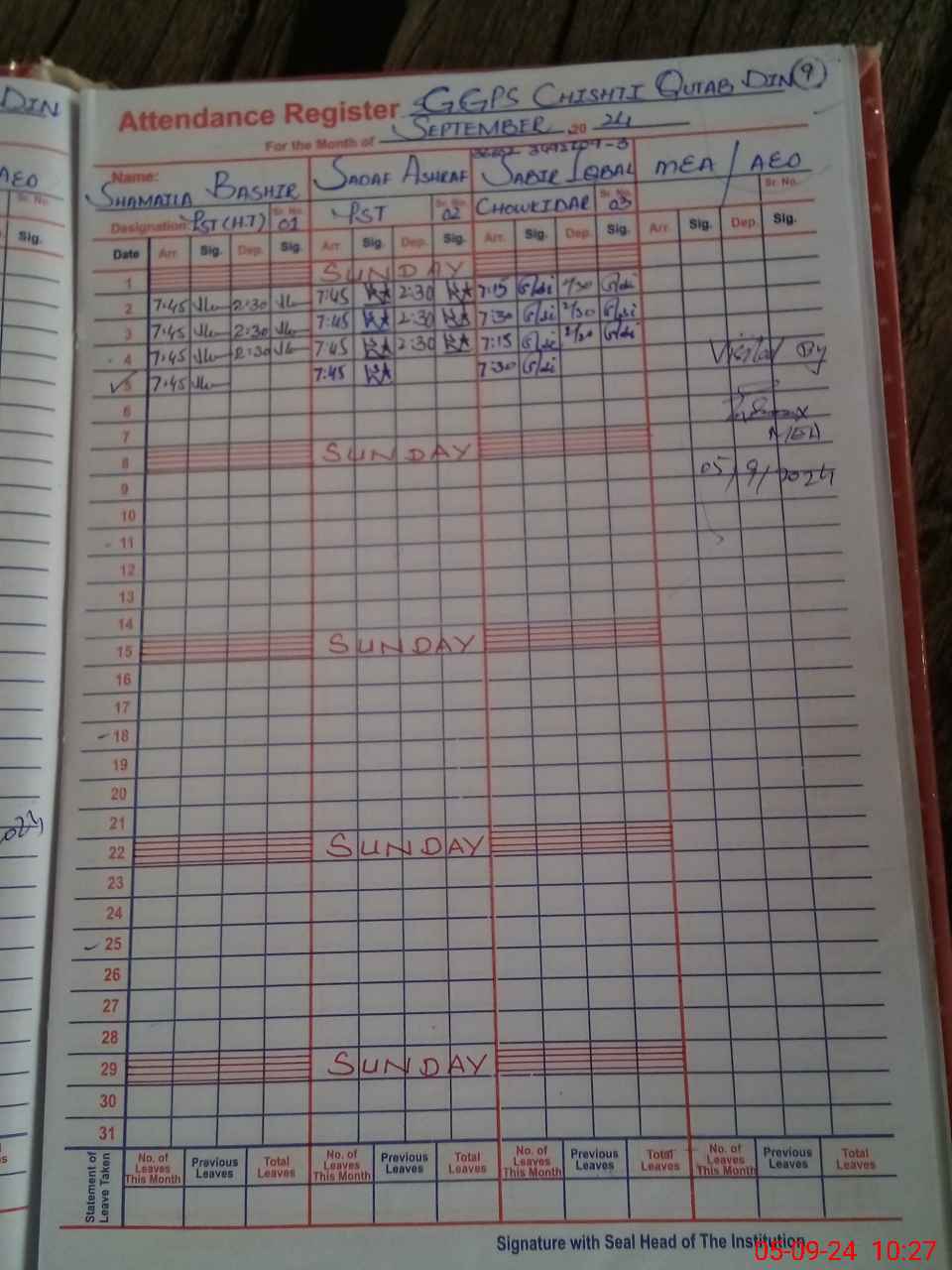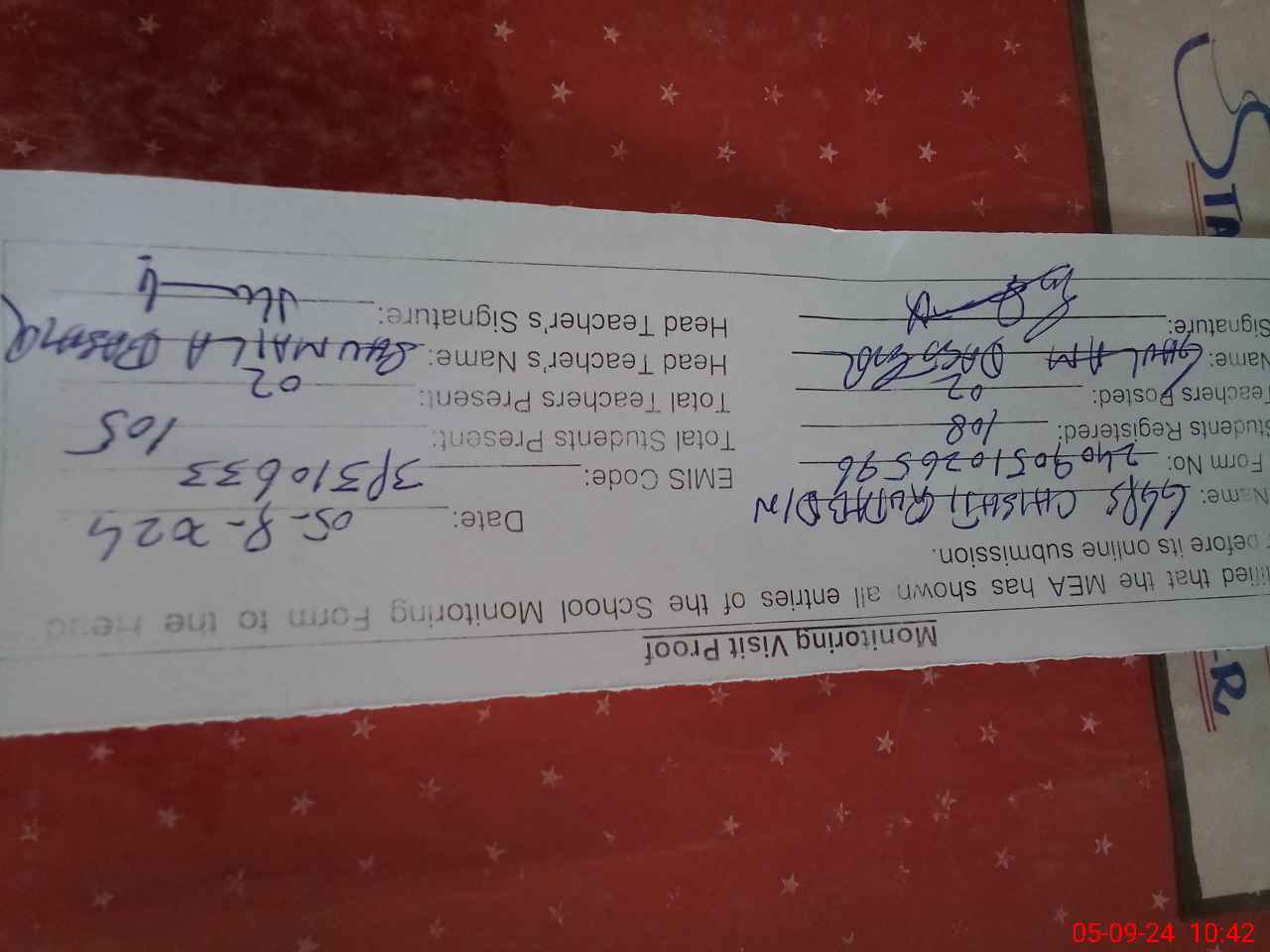 | Attendance Register | Head Teacher | MEA with School | Visit Proof |