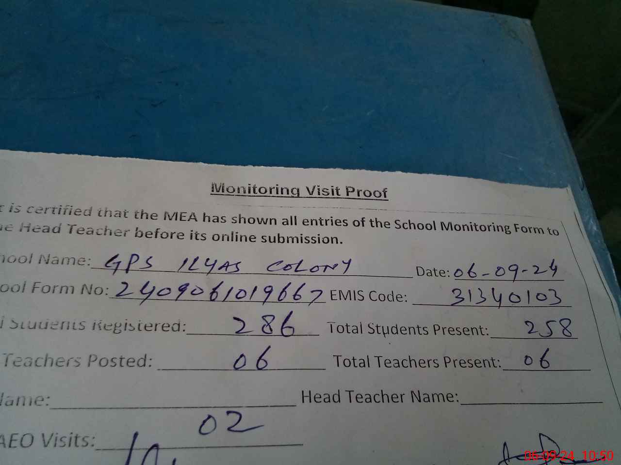 | Attendance Register | Head Teacher | MEA with School | Visit Proof |