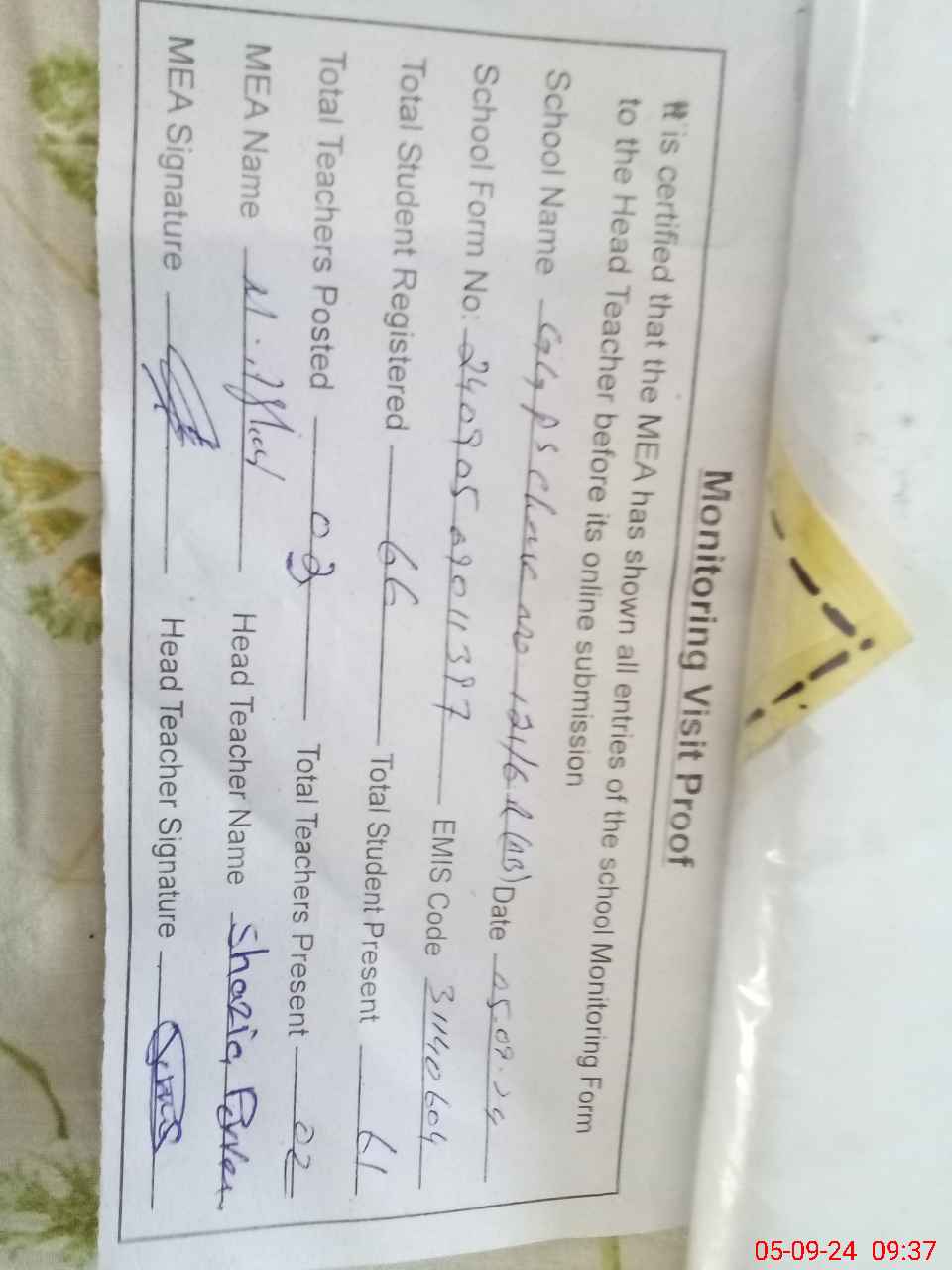| Attendance Register | Head Teacher | MEA with School | Visit Proof |