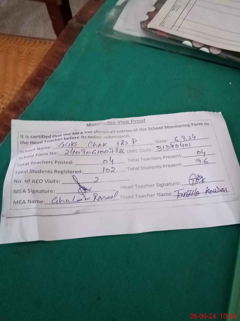 | Attendance Register | Head Teacher | MEA with School | Visit Proof |
