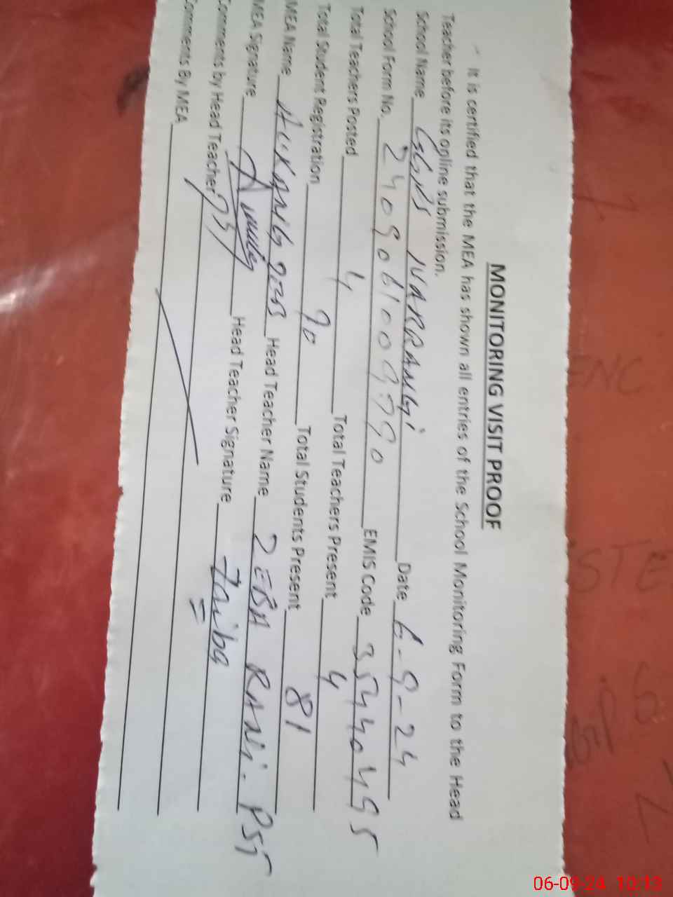 | Attendance Register | Head Teacher | MEA with School | Visit Proof |