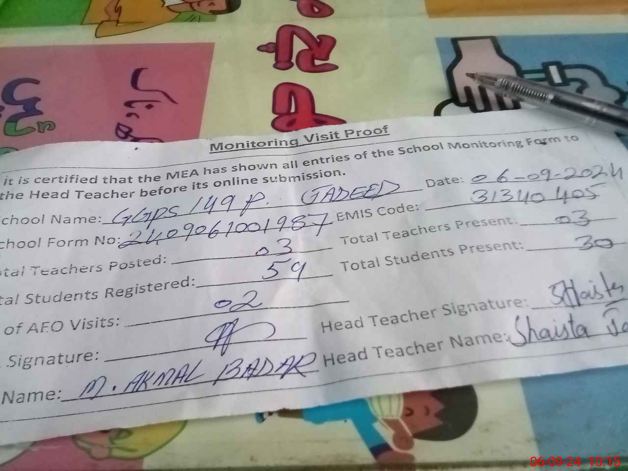 | Attendance Register | Head Teacher | MEA with School | Visit Proof |
