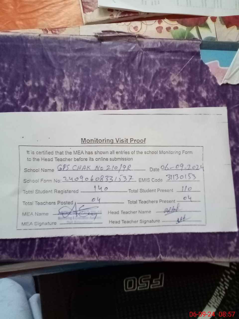| Attendance Register | Head Teacher | MEA with School | Visit Proof |