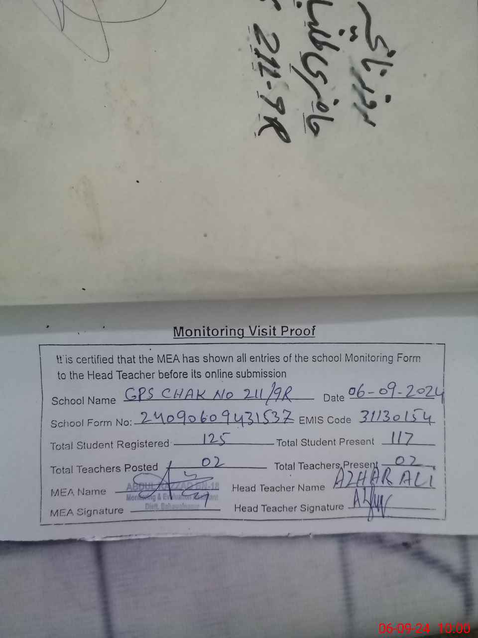 | Certified that this School was Inspected by the Undersigned MEA/DMO Today and the Information Stated Above is as Per Record. | |||||