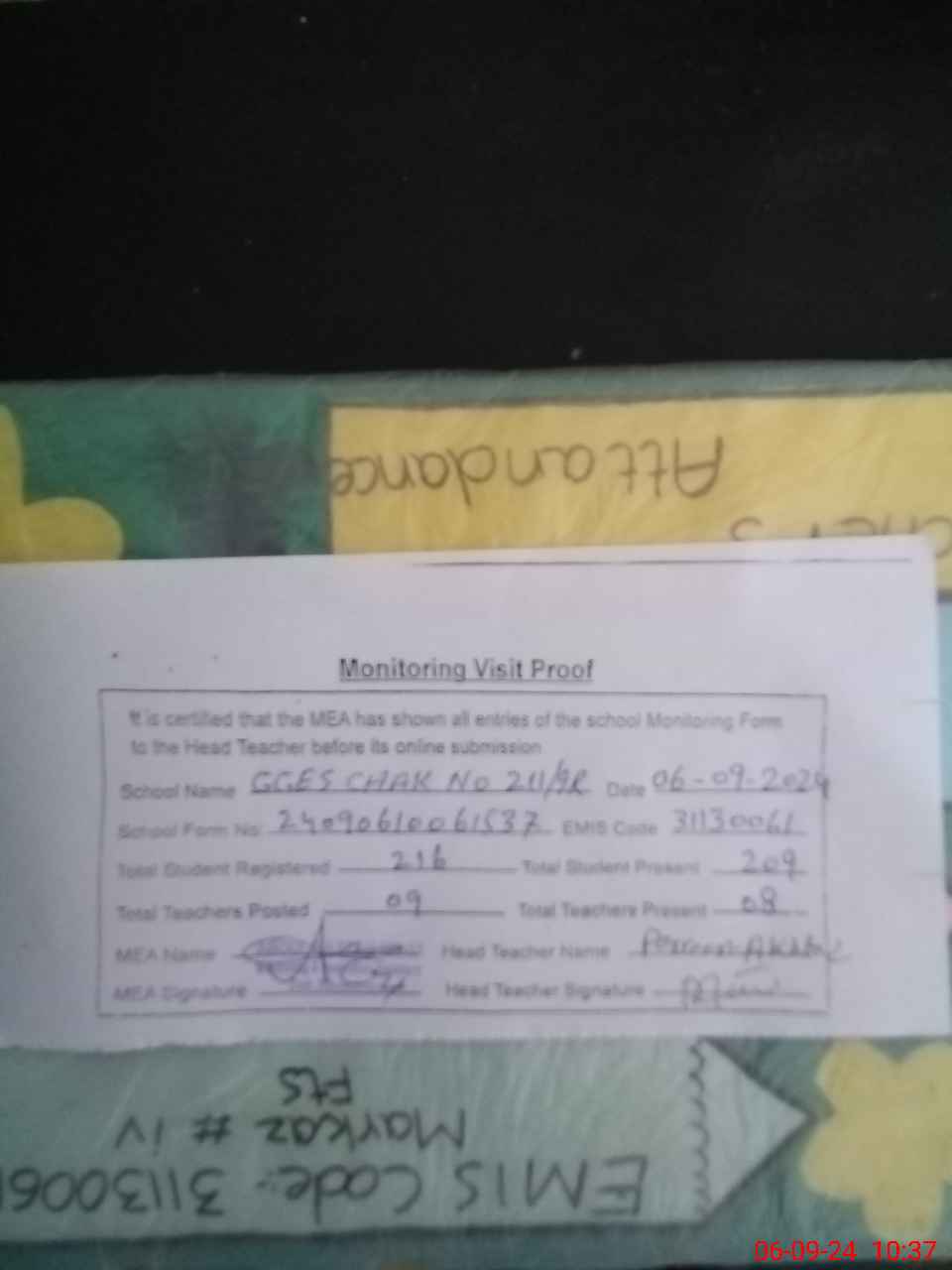 | EMIS Code: 31130061 | Name of School: GGES CHAK 211/9-R | |||